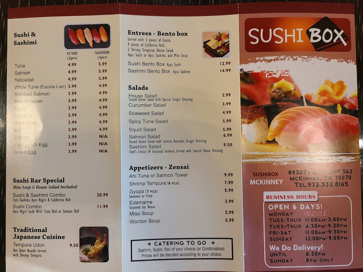 Welcome to Sushi Box, located in the heart of McKinney, TX. This vibrant destination offers a remarkable array of sushi rolls and salads, making it a must-visit for sushi enthusiasts. The menu is nothing short of exciting, featuring standout items like the Tiger Roll and Rock'n Roll, each bursting with flavors that entice the palate.